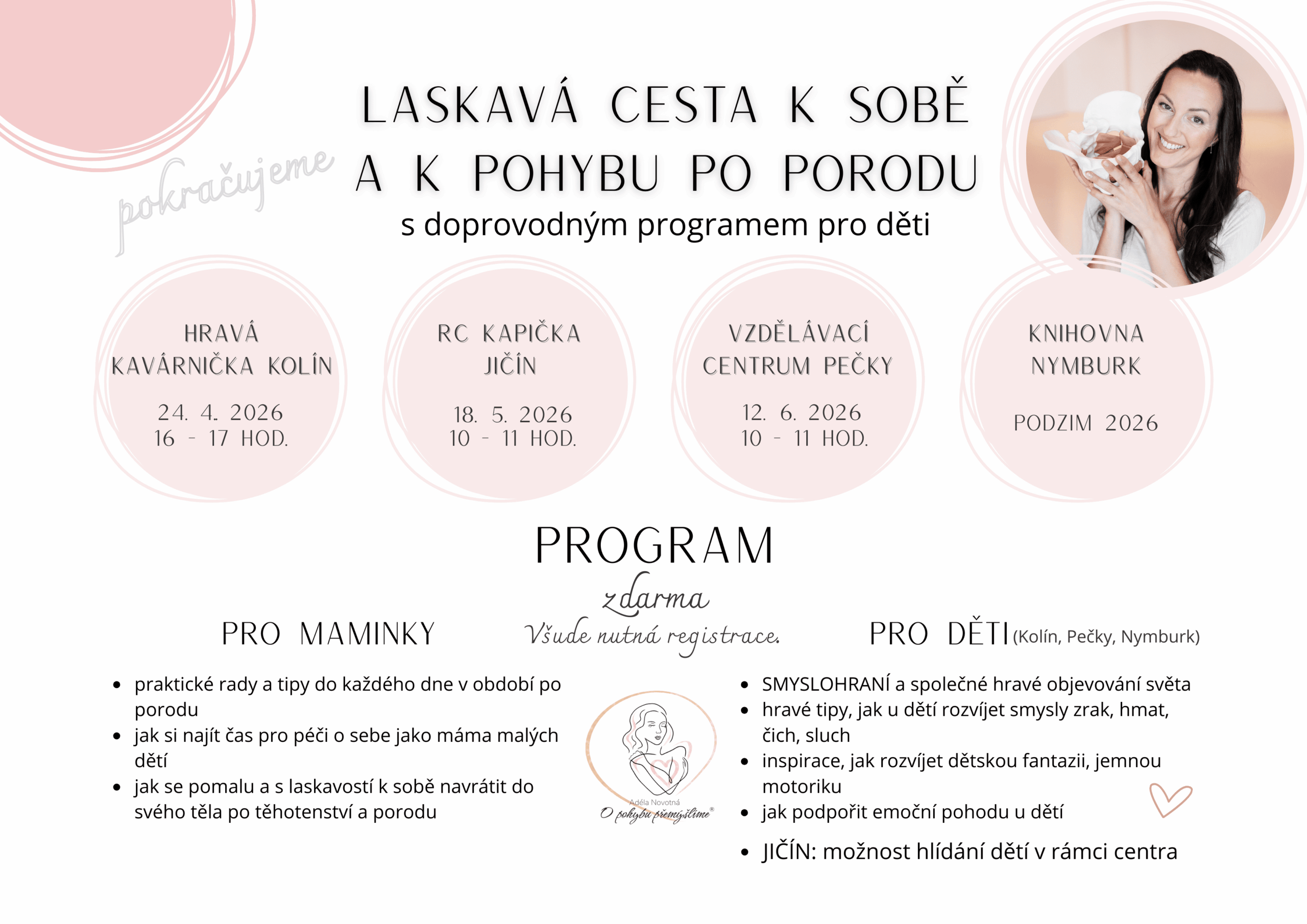 Mé kurzy jsou navrženy pro ženy po porodu – ať už jste rodila nedávno nebo máte děti již dospělé. Pomohou vám obnovit správné pohybové návyky, posílit tělo a porozumět jeho anatomii i souvislostem, které ovlivňují vaše zdraví a pohodu. V rámci kurzů vás naučím praktické cviky, které můžete snadno zařadit do každodenního života. Součástí programu jsou i video lekce, které vám umožní cvičit v pohodlí domova podle vašich časových možností.